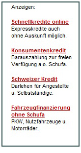 Neben Kompetenz, Seriösität und Diskretion, ist ein unschlagbarer Vorteil die schnelle Verfügbarkeit, Wenn es darum geht ein KFZ (PKW u. LKW auch Nutzfahrzeuge) schufafrei ohne Anzahlung auf Raten zu finanzieren.